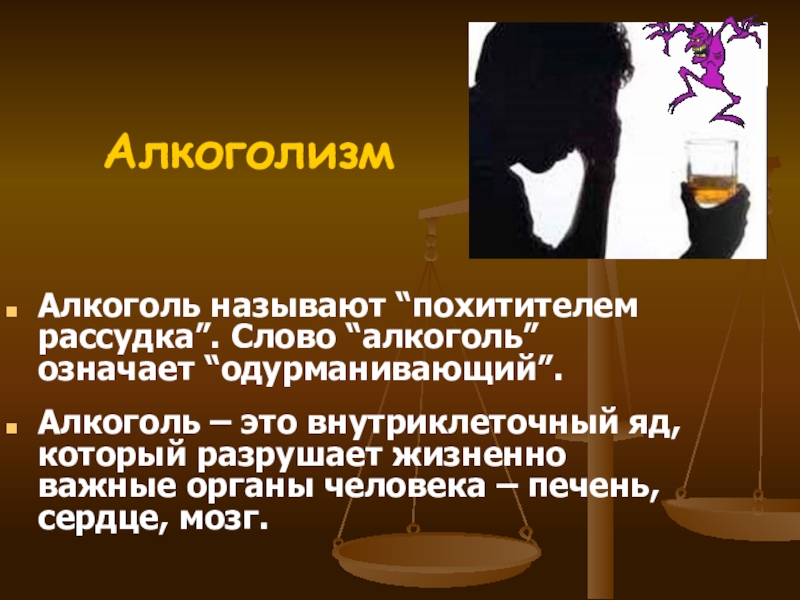 Слайд 7Алкоголь называют “похитителем рассудка”. Слово “алкоголь” означает “одурманивающий”.
