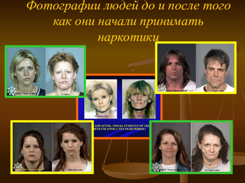 Слайд 13Фотографии людей до и после того как они начали принимать наркотики