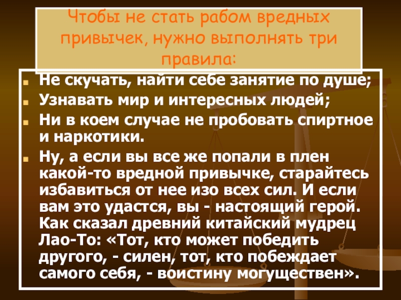 Ну, а если вы все же попали в плен какой-то вредной привычке, старайтесь избавиться от нее изо всех сил. И если вам это удастся, вы - настоящий герой. Как сказал древний китайский мудрец Лао-То: «Тот, кто может победить другого, - силен, тот, кто побеждает самого себя, - воистину могуществен».