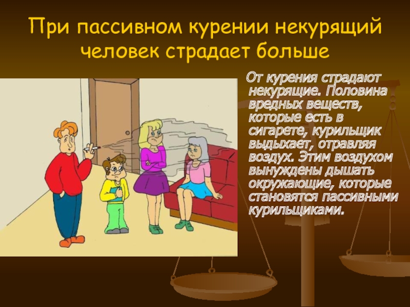 Слайд 17При пассивном курении некурящий человек страдает больше