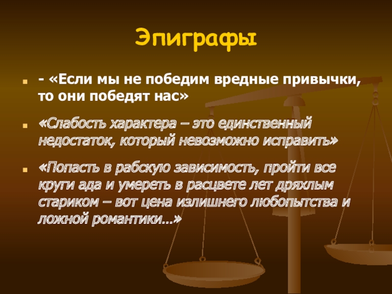 «Попасть в рабскую зависимость, пройти все круги ада и умереть в расцвете лет дряхлым стариком – вот цена излишнего любопытства и ложной романтики…»