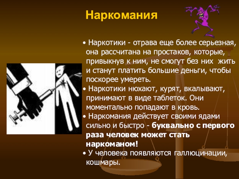 Наркотики убивают ум, здоровье, силы человека. Наркоманы распространяют чаще других СПИД.
