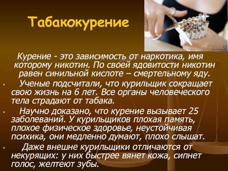 Научно доказано, что курение вызывает 25 заболеваний. У курильщиков плохая память, плохое физическое здоровье, неустойчивая психика, они медленно думают, плохо слышат.