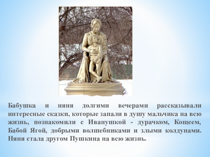 душу мальчика на всю жизнь, познакомили с Иванушкой - дурачком, Кощеем, Бабой Ягой, добрыми волшебниками и злыми колдунами. Няня стала другом Пушкина на всю жизнь.