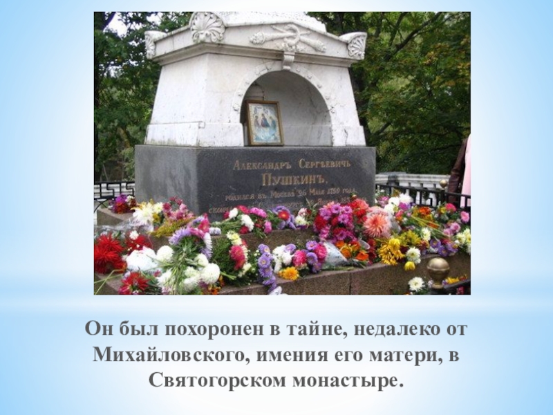 Слайд 15Он был похоронен в тайне, недалеко от Михайловского, имения его матери,