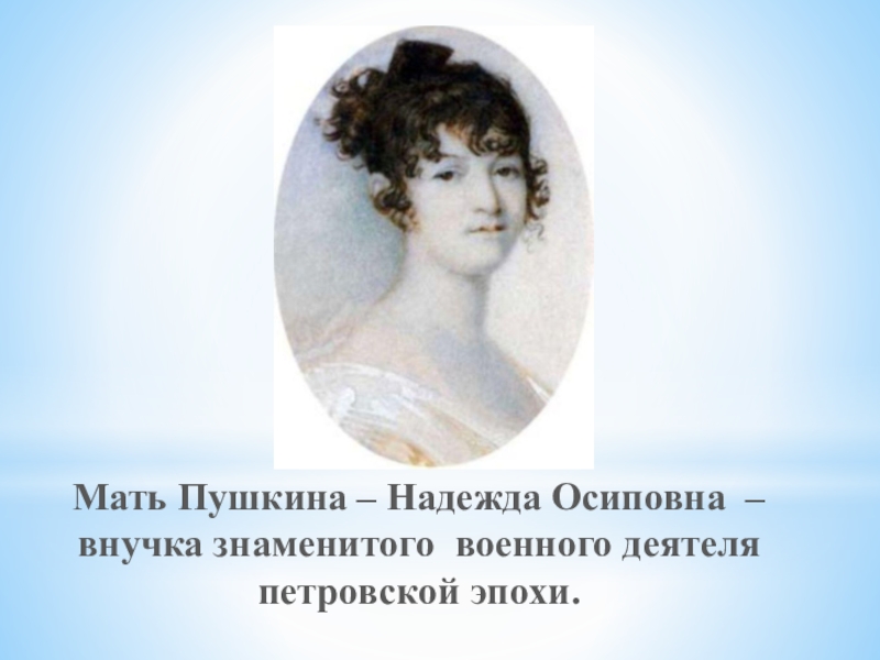 Слайд 5Мать Пушкина – Надежда Осиповна – внучка знаменитого военного деятеля петровской