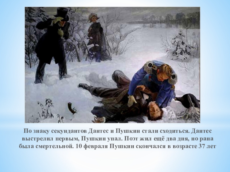 Пушкин упал. Поэт жил ещё два дня, но рана была смертельной. 10 февраля Пушкин скончался в возрасте 37 лет