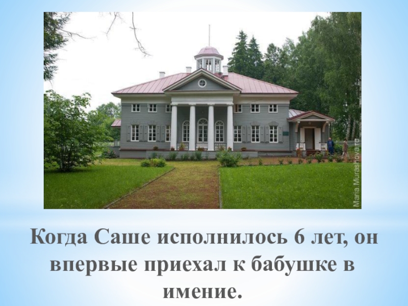 Слайд 7 Когда Саше исполнилось 6 лет, он впервые приехал к бабушке
