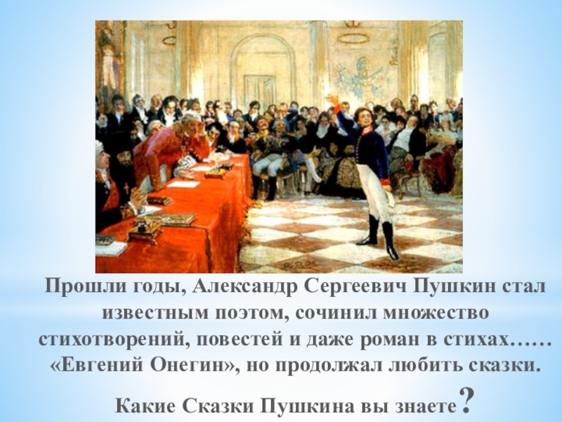 повестей и даже роман в стихах…… «Евгений Онегин», но продолжал любить сказки. Какие Сказки Пушкина вы знаете?