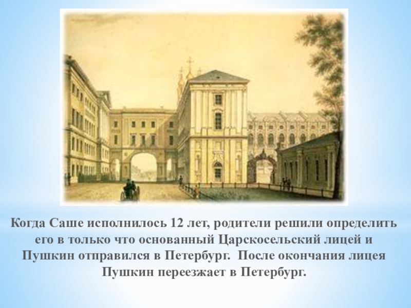 Когда Саше исполнилось 12 лет, родители решили определить его в только что основанный Царскосельский лицей и Пушкин