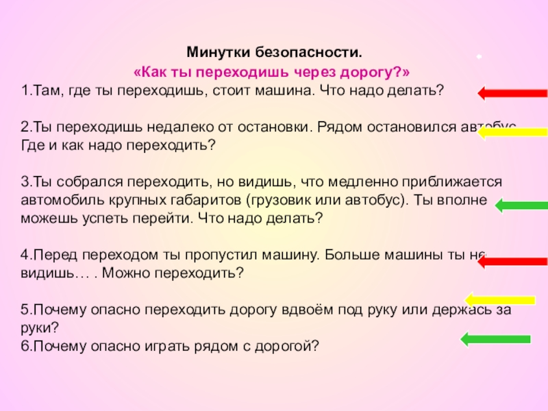 5. Когда переходит дорогу целая колонна детей, то держаться за руки безопасно. Когда же переходят двое-трое, так поступать не следует, потому что при появлении опасности дети могут тянуть друг друга в разные стороны и потерять драгоценные секунды.