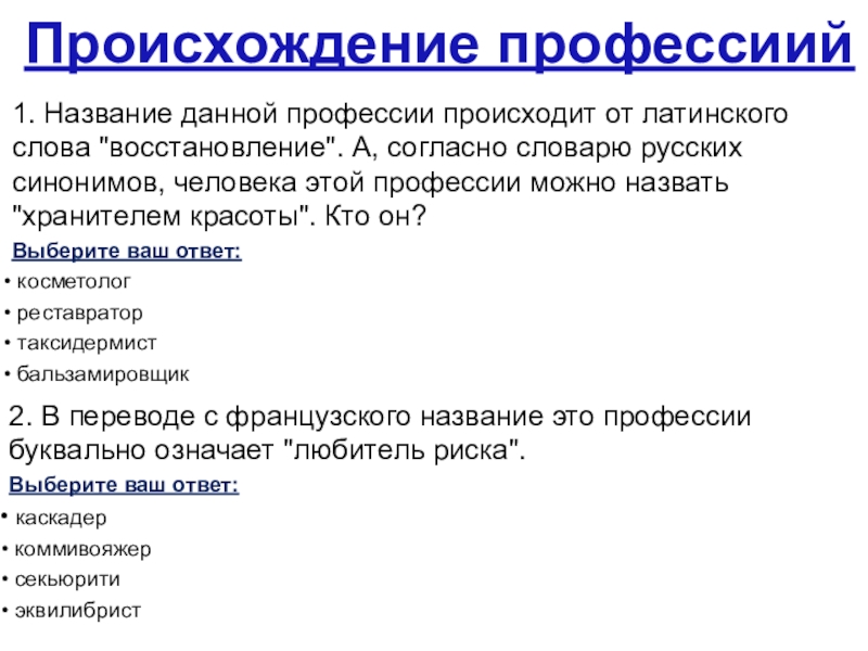 1. Название данной профессии происходит от латинского слова "восстановление". А, согласно