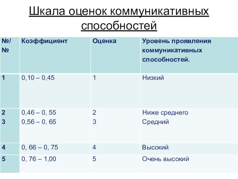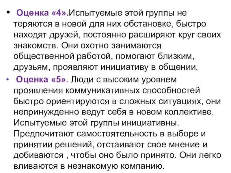 Оценка «5». Люди с высоким уровнем проявления коммуникативных способностей быстро ориентируются в сложных ситуациях, они непринужденно ведут себя в новом коллективе. Испытуемые этой группы инициативны. Предпочитают самостоятельность в выборе и принятии решений, отстаивают свое мнение и добиваются , чтобы оно было принято. Они легко вливаются в незнакомую компанию.