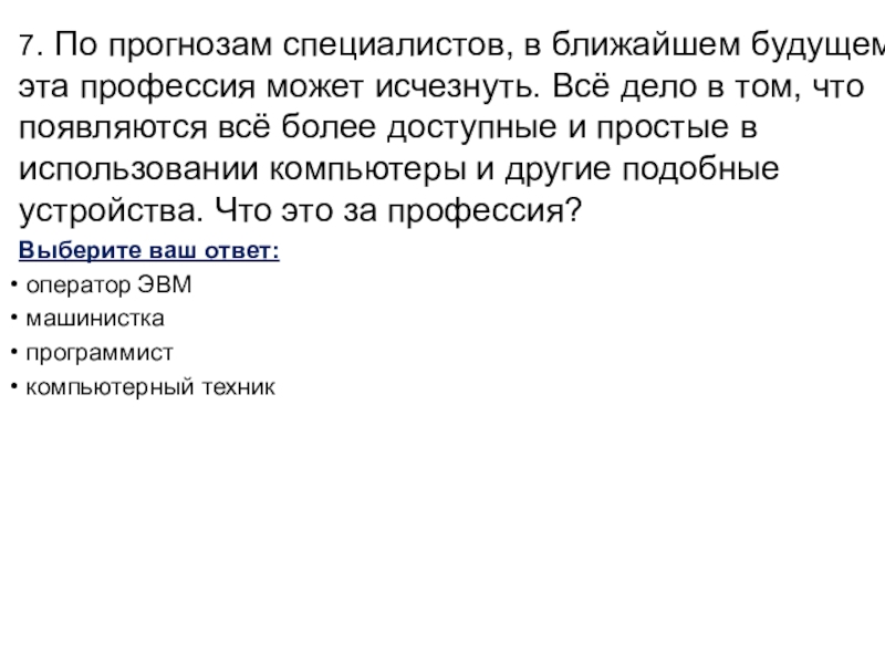 7. По прогнозам специалистов, в ближайшем будущем эта профессия может исчезнуть.