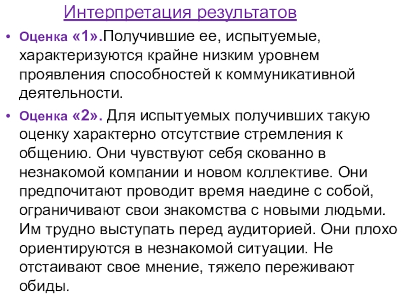 Оценка «2». Для испытуемых получивших такую оценку характерно отсутствие стремления к общению. Они чувствуют себя скованно в незнакомой компании и новом коллективе. Они предпочитают проводит время наедине с собой, ограничивают свои знакомства с новыми людьми. Им трудно выступать перед аудиторией. Они плохо ориентируются в незнакомой ситуации. Не отстаивают свое мнение, тяжело переживают обиды.
