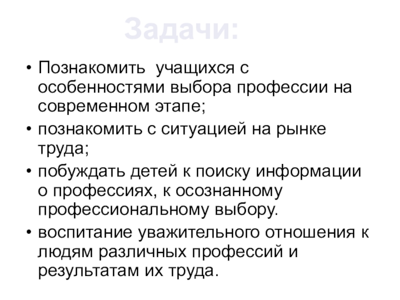 Познакомить учащихся с особенностями выбора профессии на современном этапе;