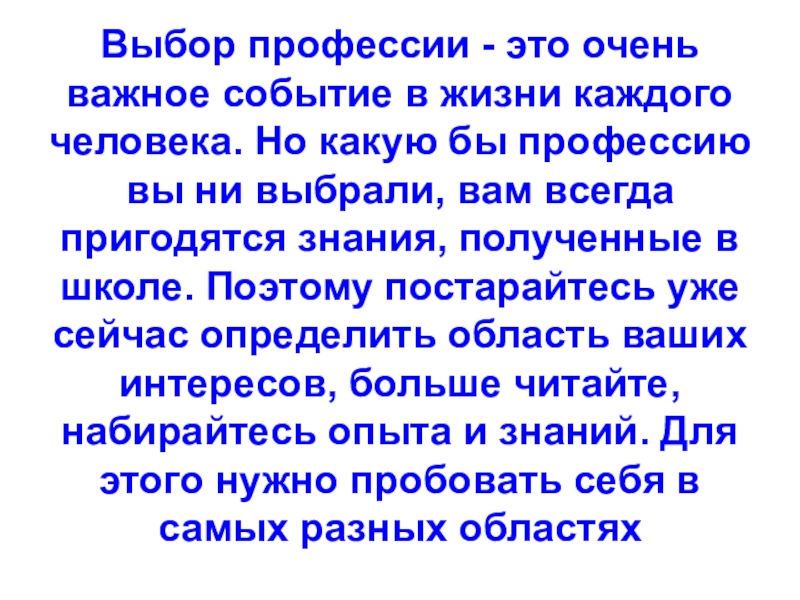 Но какую бы профессию вы ни выбрали, вам всегда пригодятся знания, полученные в школе. Поэтому постарайтесь уже сейчас определить область ваших интересов, больше читайте, набирайтесь опыта и знаний. Для этого нужно пробовать себя в самых разных областях
