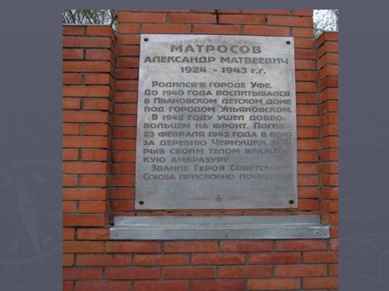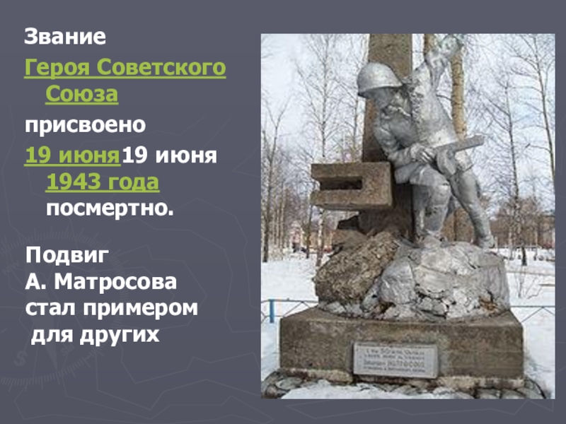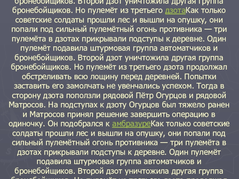 попали под сильный пулемётныйКак только советские солдаты прошли лес и вышли на опушку, они попали под сильный пулемётный огонь противника — три пулемётаКак только советские солдаты прошли лес и вышли на опушку, они попали под сильный пулемётный огонь противника — три пулемёта в дзотахКак только советские солдаты прошли лес и вышли на опушку, они попали под сильный пулемётный огонь противника — три пулемёта в дзотах прикрывали подступы к деревне. Один пулемёт подавила штурмовая группа автоматчиков и бронебойщиков. Второй дзот уничтожила другая группа бронебойщиков. Но пулемёт из третьего дзотаКак только советские солдаты прошли лес и вышли на опушку, они попали под сильный пулемётный огонь противника — три пулемёта в дзотах прикрывали подступы к деревне. Один пулемёт подавила штурмовая группа автоматчиков и бронебойщиков. Второй дзот уничтожила другая группа бронебойщиков. Но пулемёт из третьего дзота продолжал обстреливать всю лощину перед деревней. Попытки заставить его замолчать не увенчались успехом. Тогда в сторону дзота поползли рядовой Пётр Огурцов и рядовой Матросов. На подступах к дзоту Огурцов был тяжело ранен и Матросов принял решение завершить операцию в одиночку. Он подобрался к амбразуреКак только советские солдаты прошли лес и вышли на опушку, они попали под сильный пулемётный огонь противника — три пулемёта в дзотах прикрывали подступы к деревне. Один пулемёт подавила штурмовая группа автоматчиков и бронебойщиков. Второй дзот уничтожила другая группа бронебойщиков. Но пулемёт из третьего дзота продолжал обстреливать всю лощину перед деревней. Попытки заставить его замолчать не увенчались успехом. Тогда в сторону дзота поползли рядовой Пётр Огурцов и рядовой Матросов. На подступах к дзоту Огурцов был тяжело ранен и Матросов принял решение завершить операцию в одиночку. Он подобрался к амбразуре с фланга и бросил две гранаты. Пулемёт замолчал. Но как только бойцы поднялись в атаку, пулемёт снова ожил. Тогда Матросов поднялся, рывком бросился к дзоту и своим телом закрыл амбразуру. Ценою своей жизни он содействовал выполнению боевой задачи подразделением.
