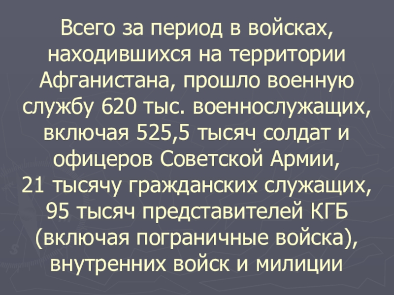 Слайд 13Всего за период в войсках, находившихся на территории Афганистана, прошло военную