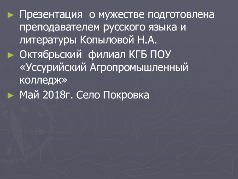 Слайд 30Презентация о мужестве подготовлена преподавателем русского языка и литературы Копыловой Н.А.