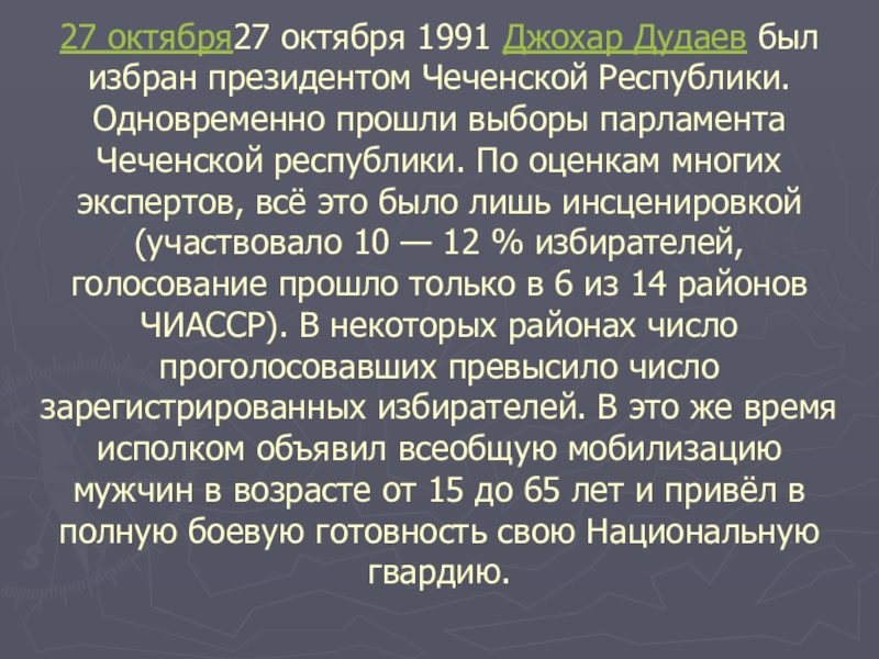 Слайд 2027 октября27 октября 1991 Джохар Дудаев был избран президентом Чеченской Республики.