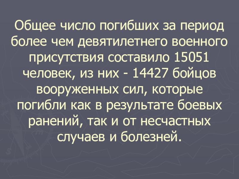 Слайд 14Общее число погибших за период более чем девятилетнего военного присутствия составило