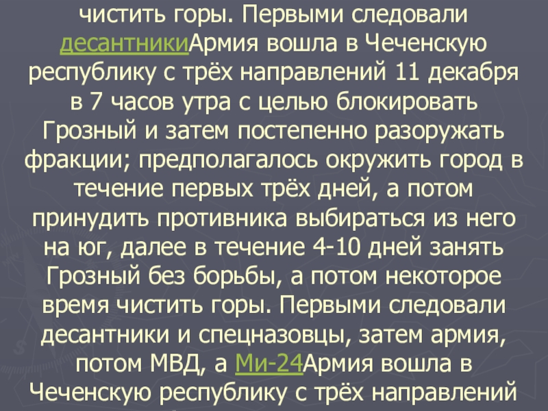 7 часов утра с целью блокировать ГрозныйАрмия вошла в Чеченскую республику с трёх направлений 11 декабря в 7 часов утра с целью блокировать Грозный и затем постепенно разоружать фракции; предполагалось окружить город в течение первых трёх дней, а потом принудить противника выбираться из него на юг, далее в течение 4-10 дней занять Грозный без борьбы, а потом некоторое время чистить горы. Первыми следовали десантникиАрмия вошла в Чеченскую республику с трёх направлений 11 декабря в 7 часов утра с целью блокировать Грозный и затем постепенно разоружать фракции; предполагалось окружить город в течение первых трёх дней, а потом принудить противника выбираться из него на юг, далее в течение 4-10 дней занять Грозный без борьбы, а потом некоторое время чистить горы. Первыми следовали десантники и спецназовцы, затем армия, потом МВД, а Ми-24Армия вошла в Чеченскую республику с трёх направлений 11 декабря в 7 часов утра с целью блокировать Грозный и затем постепенно разоружать фракции; предполагалось окружить город в течение первых трёх дней, а потом принудить противника выбираться из него на юг, далее в течение 4-10 дней занять Грозный без борьбы, а потом некоторое время чистить горы. Первыми следовали десантники и спецназовцы, затем армия, потом МВД, а Ми-24 и Су-25 прикрывали колонны с воздуха.