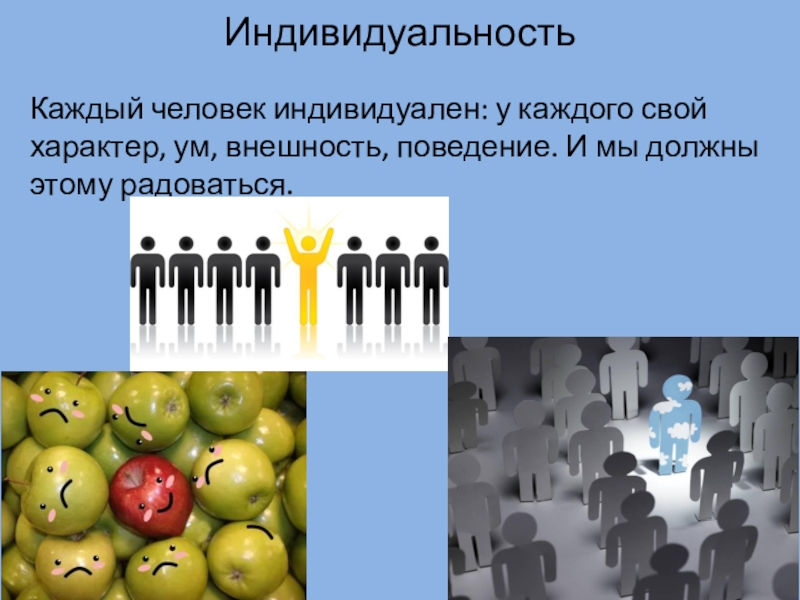 ИндивидуальностьКаждый человек индивидуален: у каждого свой характер, ум, внешность, поведение. И мы должны этому радоваться.
