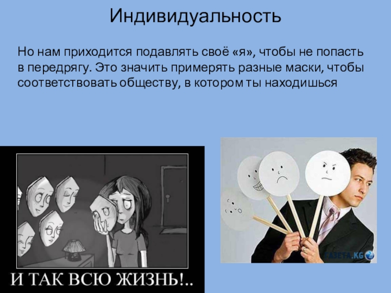 ИндивидуальностьНо нам приходится подавлять своё «я», чтобы не попасть в передрягу. Это значить примерять разные маски, чтобы