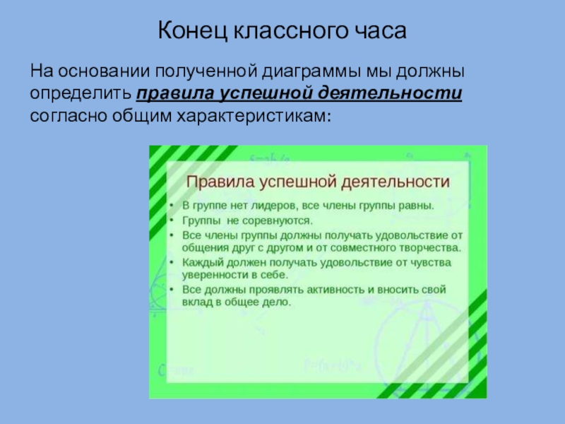 Конец классного часаНа основании полученной диаграммы мы должны определить правила успешной деятельности согласно общим характеристикам: