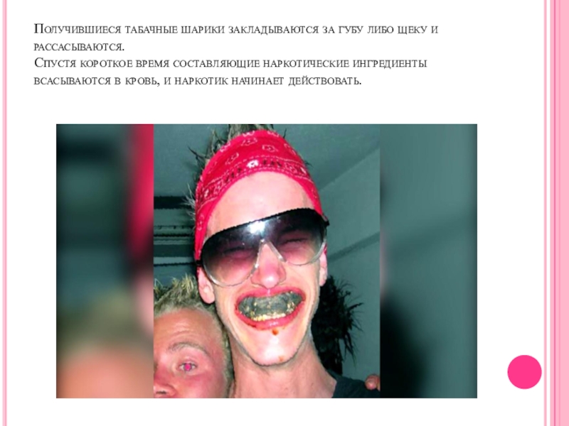 Слайд 7Получившиеся табачные шарики закладываются за губу либо щеку и рассасываются.