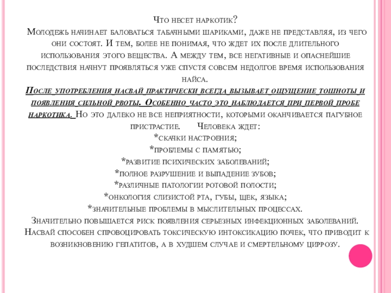 чего они состоят. И тем, более не понимая, что ждет их после длительного использования этого вещества. А между тем, все негативные и опаснейшие последствия начнут проявляться уже спустя совсем недолгое время использования найса.