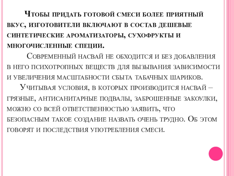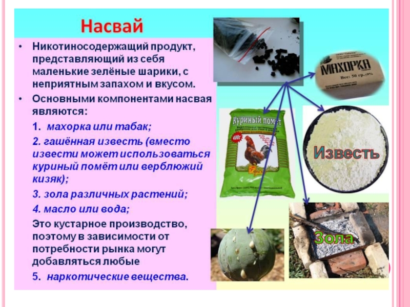Современный насвай не обходится и без добавления в него психотропных веществ для вызывания зависимости и увеличения масштабности сбыта табачных шариков.