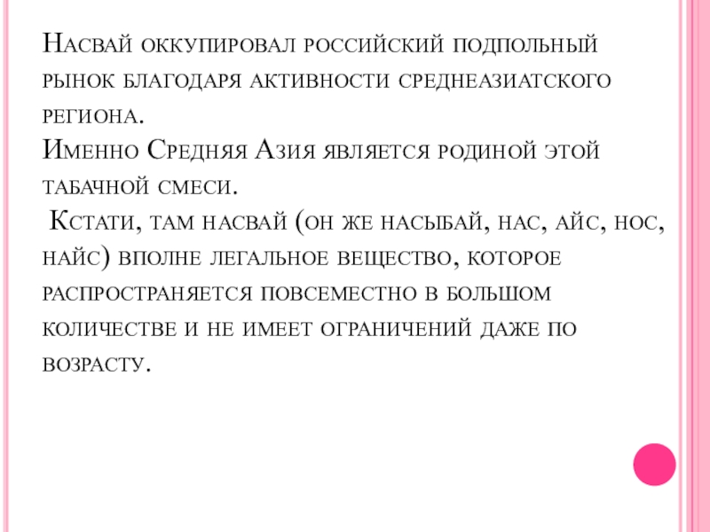 Слайд 3Насвай оккупировал российский подпольный рынок благодаря активности среднеазиатского региона.