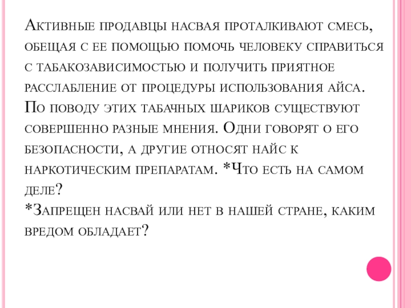 Слайд 4Активные продавцы насвая проталкивают смесь, обещая с ее помощью помочь человеку