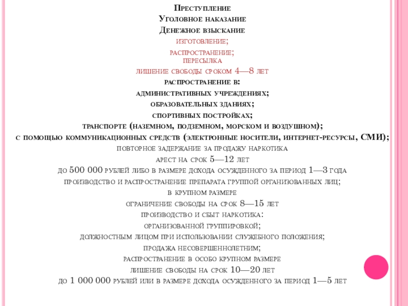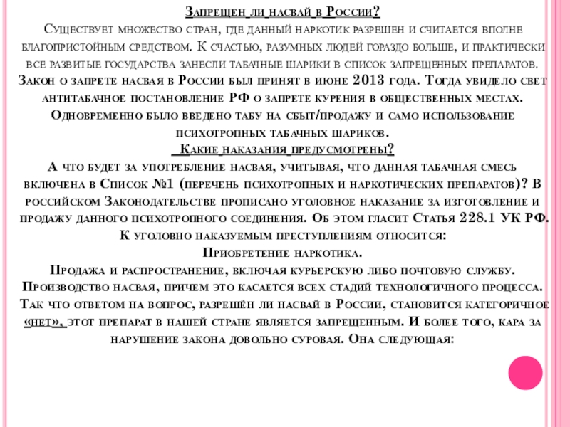 Так что ответом на вопрос, разрешён ли насвай в России, становится категоричное «нет», этот препарат в нашей стране является запрещенным. И более того, кара за нарушение закона довольно суровая. Она следующая:
