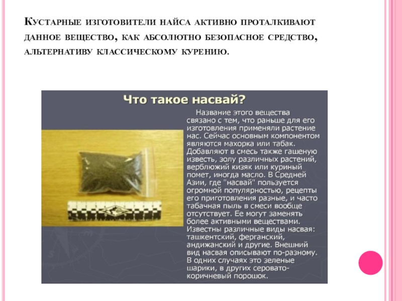 Слайд 8Кустарные изготовители найса активно проталкивают данное вещество, как абсолютно безопасное средство,