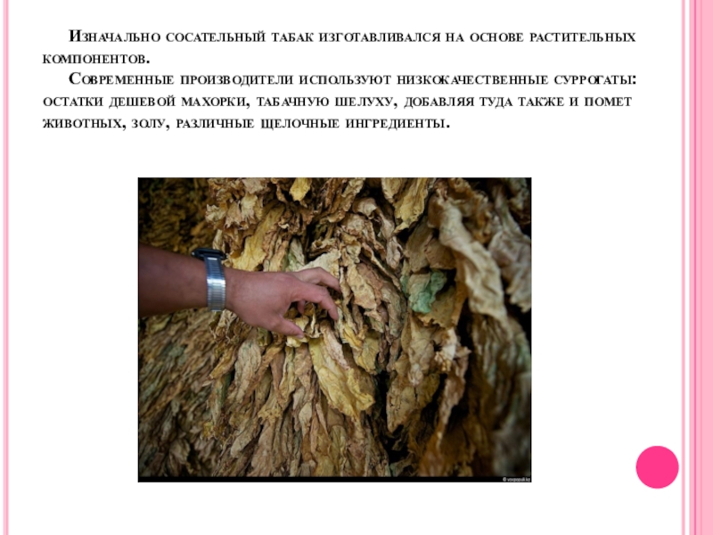 Слайд 6 Изначально сосательный табак изготавливался на основе растительных компонентов.