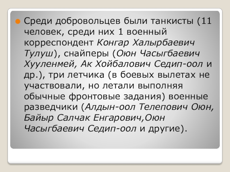 Халырбаевич Тулуш), снайперы (Оюн Часыгбаевич Хууленмей, Ак Хойбалович Седип-оол и др.), три летчика (в боевых вылетах не участвовали, но летали выполняя обычные фронтовые задания) военные разведчики (Алдын-оол Телепович Оюн, Байыр Салчак Енгарович,Оюн Часыгбаевич Седип-оол и другие).