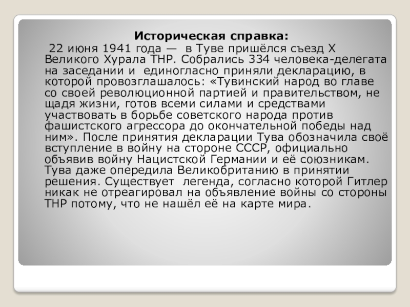 съезд X Великого Хурала ТНР. Собрались 334 человека-делегата на заседании и единогласно приняли декларацию, в которой провозглашалось: «Тувинский народ во главе со своей революционной партией и правительством, не щадя жизни, готов всеми силами и средствами участвовать в борьбе советского народа против фашистского агрессора до окончательной победы над ним». После принятия декларации Тува обозначила своё вступление в войну на стороне СССР, официально объявив войну Нацистской Германии и её союзникам. Тува даже опередила Великобританию в принятии решения. Существует легенда, согласно которой Гитлер никак не отреагировал на объявление войны со стороны ТНР потому, что не нашёл её на карте мира.