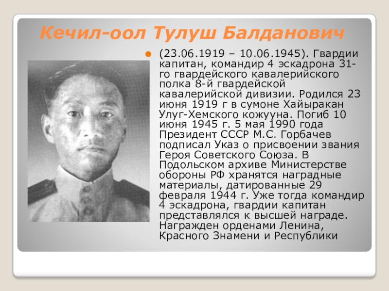 гвардейского кавалерийского полка 8-й гвардейской кавалерийской дивизии. Родился 23 июня 1919 г в сумоне Хайыракан Улуг-Хемского кожууна. Погиб 10 июня 1945 г. 5 мая 1990 года Президент СССР М.С. Горбачев подписал Указ о присвоении звания Героя Советского Союза. В Подольском архиве Министерстве обороны РФ хранятся наградные материалы, датированные 29 февраля 1944 г. Уже тогда командир 4 эскадрона, гвардии капитан представлялся к высшей награде. Награжден орденами Ленина, Красного Знамени и Республики