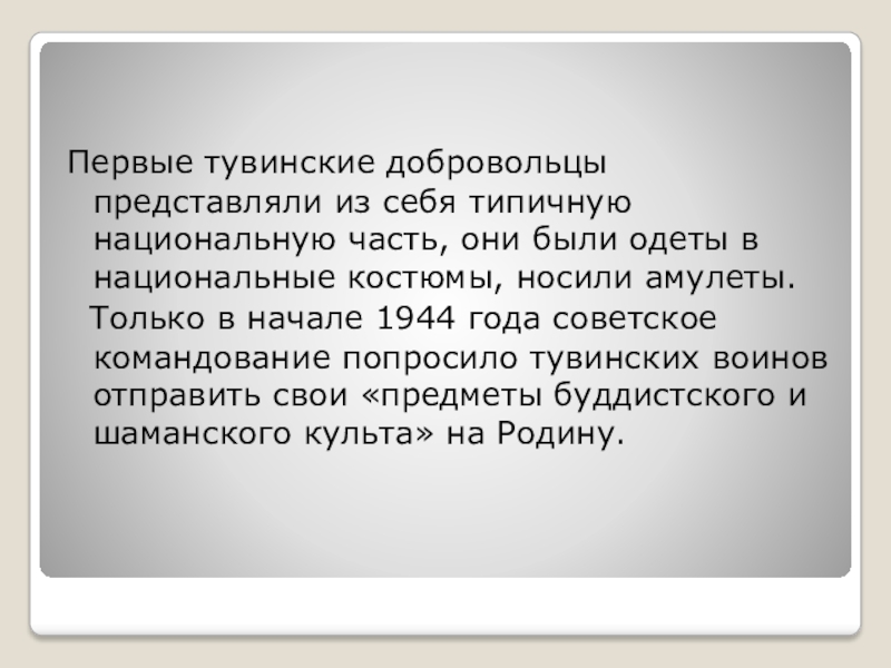 Только в начале 1944 года советское командование попросило тувинских воинов отправить свои «предметы буддистского и шаманского культа» на Родину.
