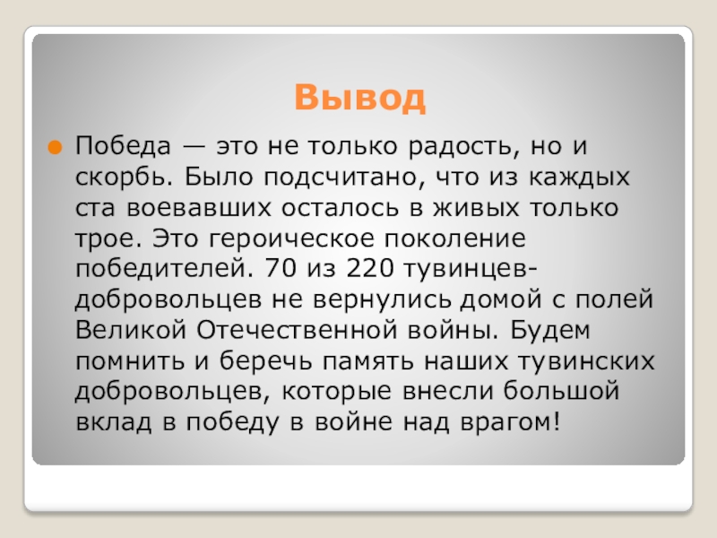 что из каждых ста воевавших осталось в живых только трое. Это героическое поколение победителей. 70 из 220 тувинцев-добровольцев не вернулись домой с полей Великой Отечественной войны. Будем помнить и беречь память наших тувинских добровольцев, которые внесли большой вклад в победу в войне над врагом!