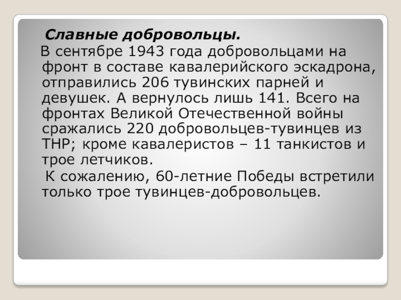 в составе кавалерийского эскадрона, отправились 206 тувинских парней и девушек. А вернулось лишь 141. Всего на фронтах Великой Отечественной войны сражались 220 добровольцев-тувинцев из ТНР; кроме кавалеристов – 11 танкистов и трое летчиков.