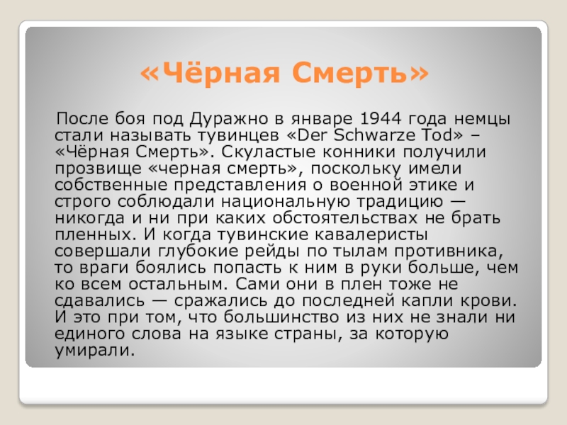 стали называть тувинцев «Der Schwarze Tod» – «Чёрная Смерть». Скуластые конники получили прозвище «черная смерть», поскольку имели собственные представления о военной этике и строго соблюдали национальную традицию — никогда и ни при каких обстоятельствах не брать пленных. И когда тувинские кавалеристы совершали глубокие рейды по тылам противника, то враги боялись попасть к ним в руки больше, чем ко всем остальным. Сами они в плен тоже не сдавались — сражались до последней капли крови. И это при том, что большинство из них не знали ни единого слова на языке страны, за которую умирали.