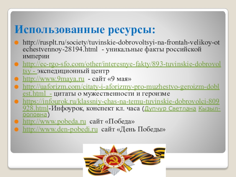 https://infourok.ru/klassniy-chas-na-temu-tuvinskie-dobrovolci-809928.html-Инфоурок, конспект кл. часа (Дупчур Светлана Кызыл-ооловна)