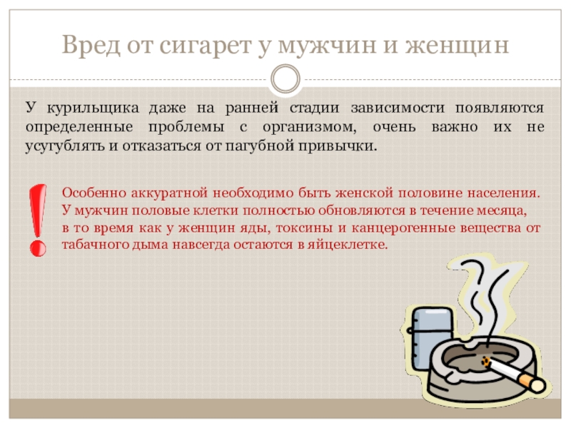 в то время как у женщин яды, токсины и канцерогенные вещества от табачного дыма навсегда остаются в яйцеклетке.