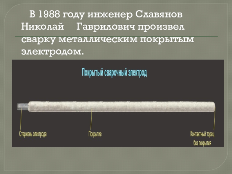 В 1988 году инженер Славянов Николай   Гаврилович произвел сварку металлическим покрытым электродом.