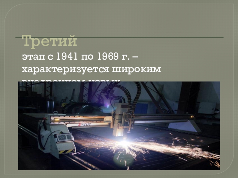 этап с 1941 по 1969 г. – характеризуется широким внедрением новых механизированных способов сварки сталей, цветных металлов и сплавов.