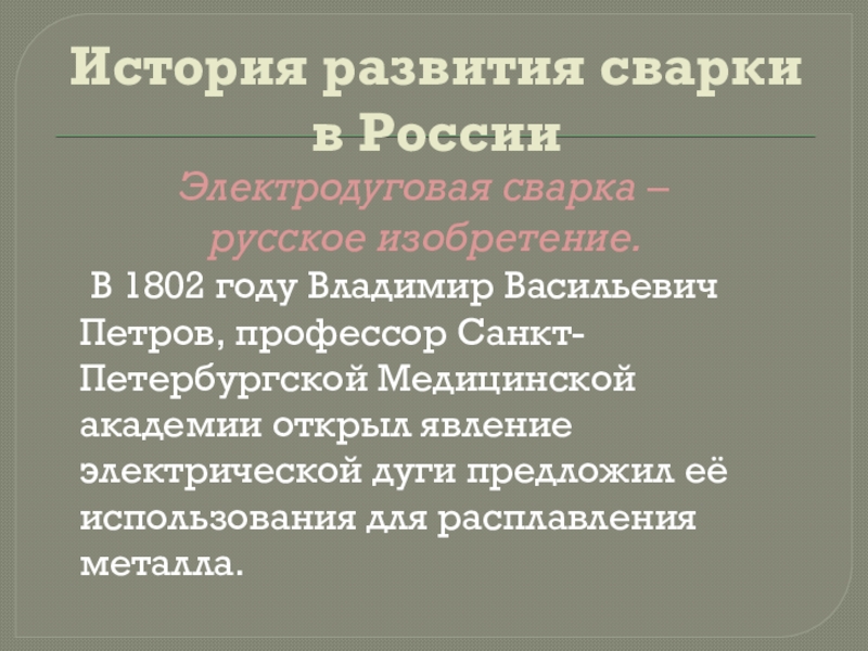 В 1802 году Владимир Васильевич Петров, профессор Санкт-Петербургской Медицинской академии открыл явление электрической дуги предложил её использования для расплавления металла.